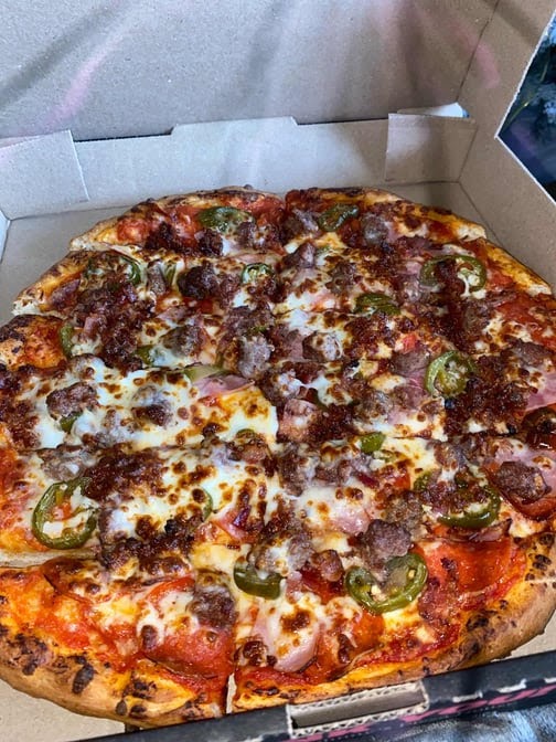 this pizza is perfect. So good, you’ll be back for more! The toppings just compliment each other perfectly, it’s a great cheese to tomato ratio, the crust is slightly crispy. It’s just a really good pizza all around.